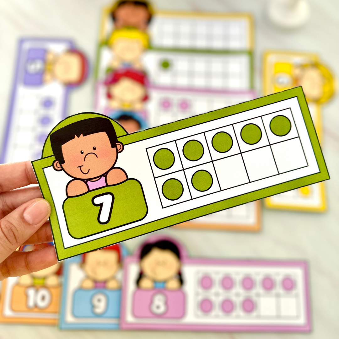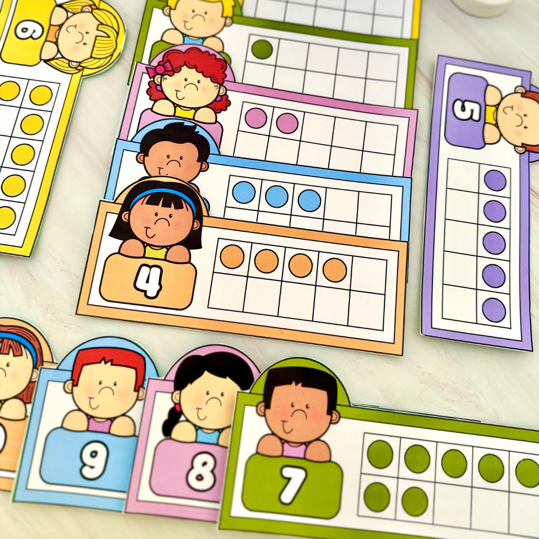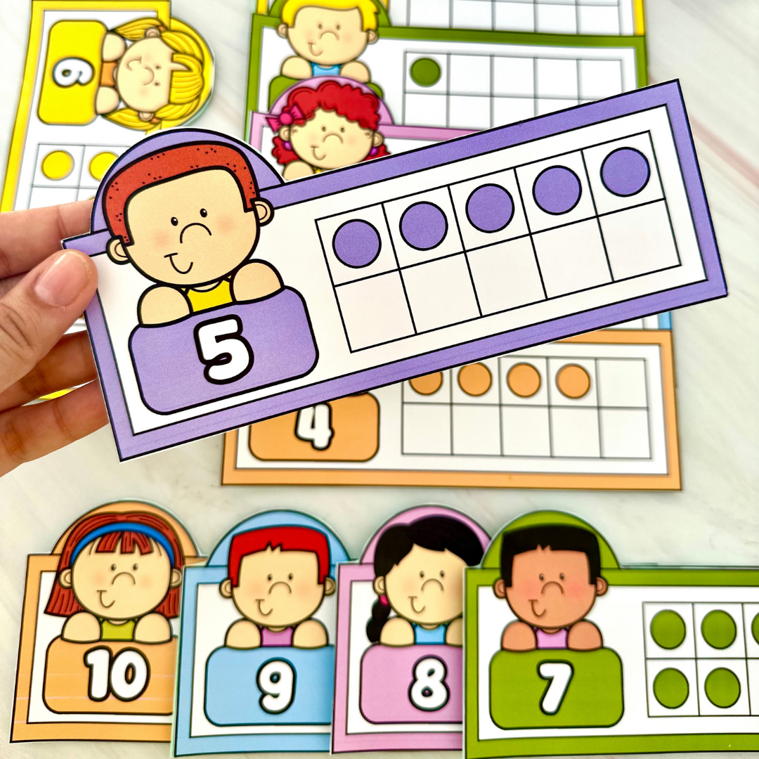 Cada ficha incluye bolitas de conteo (ilustradas) para facilitar la comprensión y el conteo oral.